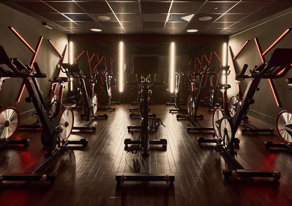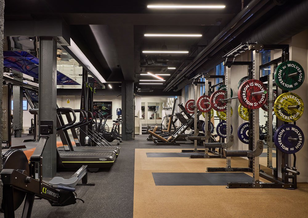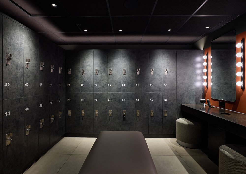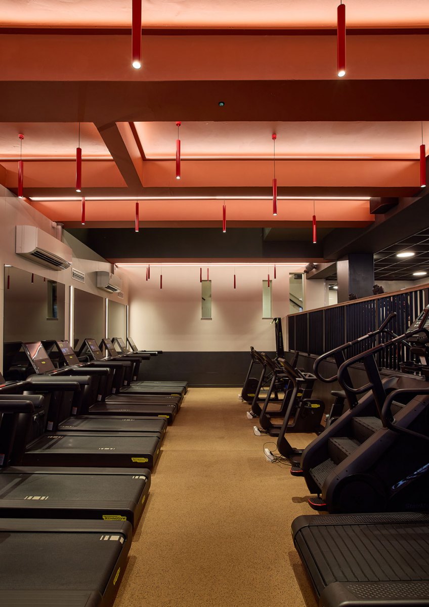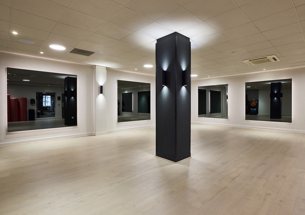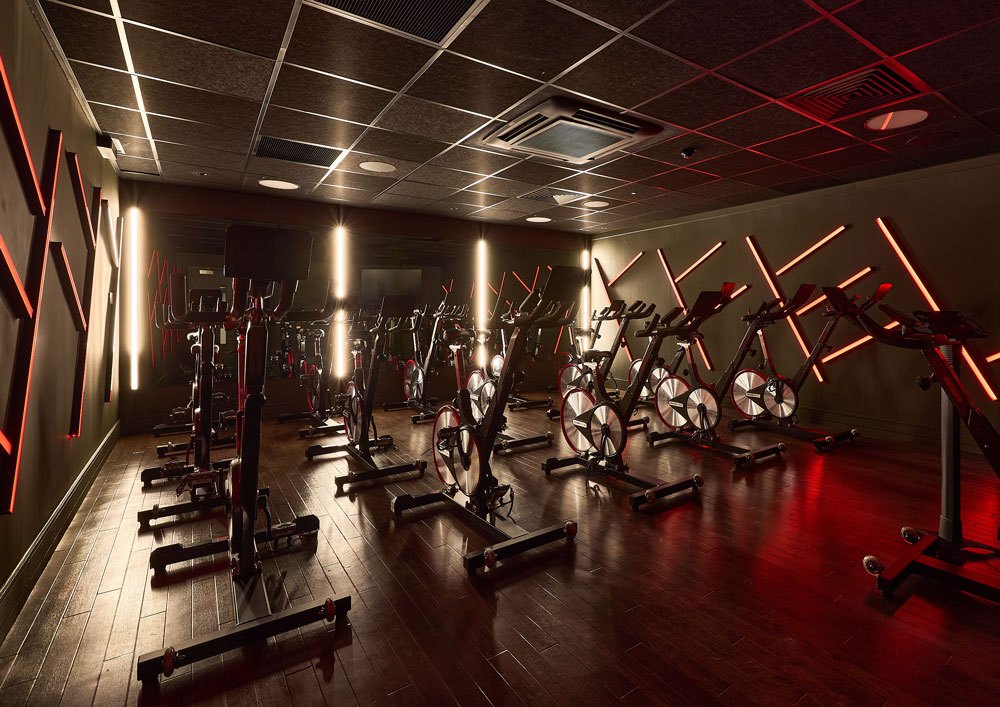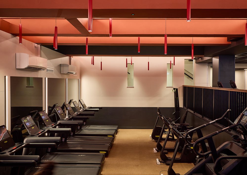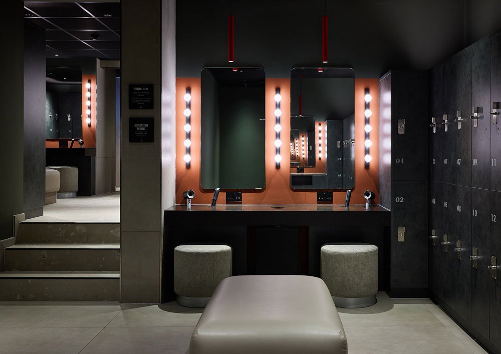 To add visual interest and energy, a series of bold red tubular pendants were introduced in the double-height cardio area. Throughout the space, elements included concealed LED lighting along the red-panelled corridor to colour-changing LED strip lights in the spin studio. Up/down wall lights accentuate the columns, while Hollywood-style wall lights and red tubular spotlights bring a refined, sophisticated touch to the changing rooms.