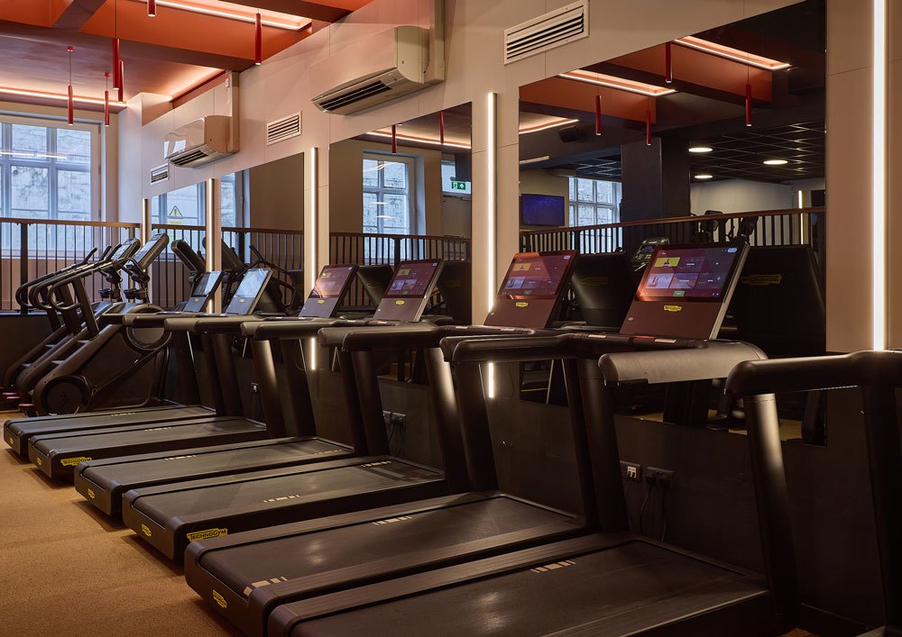 LED strip lighting was positioned on either side of the mirrors for balanced illumination, while sleek black suspended pendants were used to light the large weights area with some pendants finished in bespoke red RAL colour to reflect Fitness First’s signature colour palette.